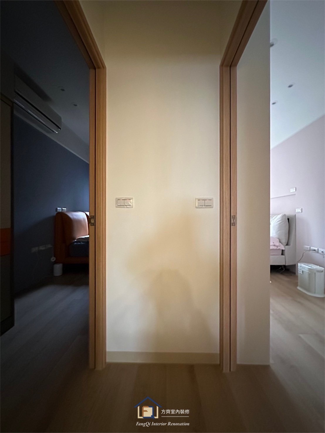 對於有兩個孩童以上的家庭,勢必需要提供給孩童獨立的起居空間,本案係以原6坪大的臥房分割成兩間3坪的孩童房,並考慮到孩童的使用情況及未來需求,對於隔音工項特別加強,其隔間牆採用1.8吋角材+100K隔音岩棉+內外側4分夾板補強+9分矽酸鈣板封板,內襯隔音效果可比擬實心牆,並且內層加入了夾板層,對於任何壁掛物件或未來需要增加系統吊櫃都可直接鎖固,無須進行任何補強或無法安裝,雖然每位孩童的獨立空間僅有3坪大小,但經過空間規劃後仍可置入雙人床架組、升降電腦桌、5尺衣櫥、化妝台(或懶人椅)以上家俱,提供每位孩童安心成長的空間。